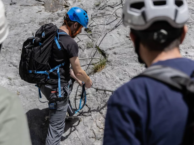 Démonstration de l'équipement sur la Via Ferrata à un groupe.